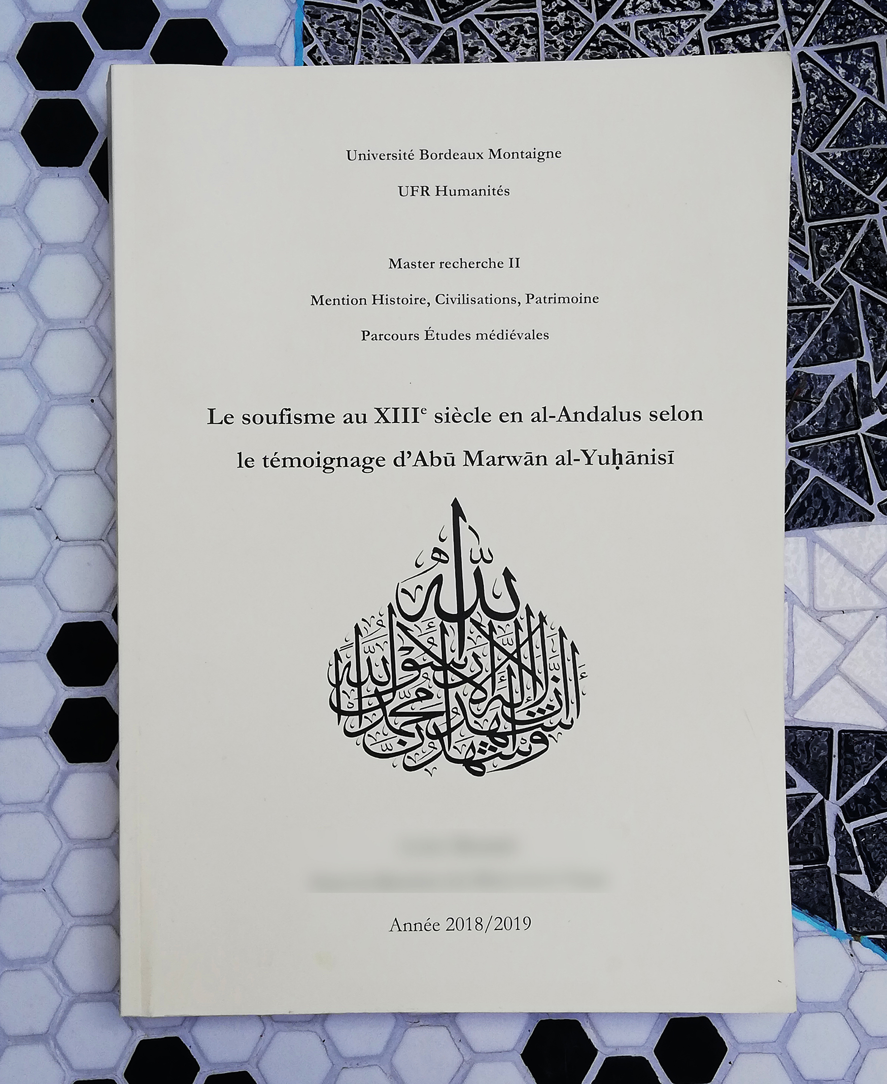 C’est la base même de ma formation scientifique, ayant effectué 5 années d’étude en histoire (à l’université Bordeaux Montaigne) et rédigé un mémoire dédié au soufisme andalou au XIIIe siècle :
