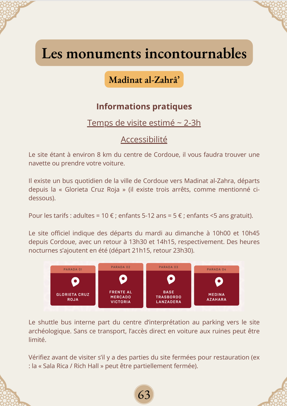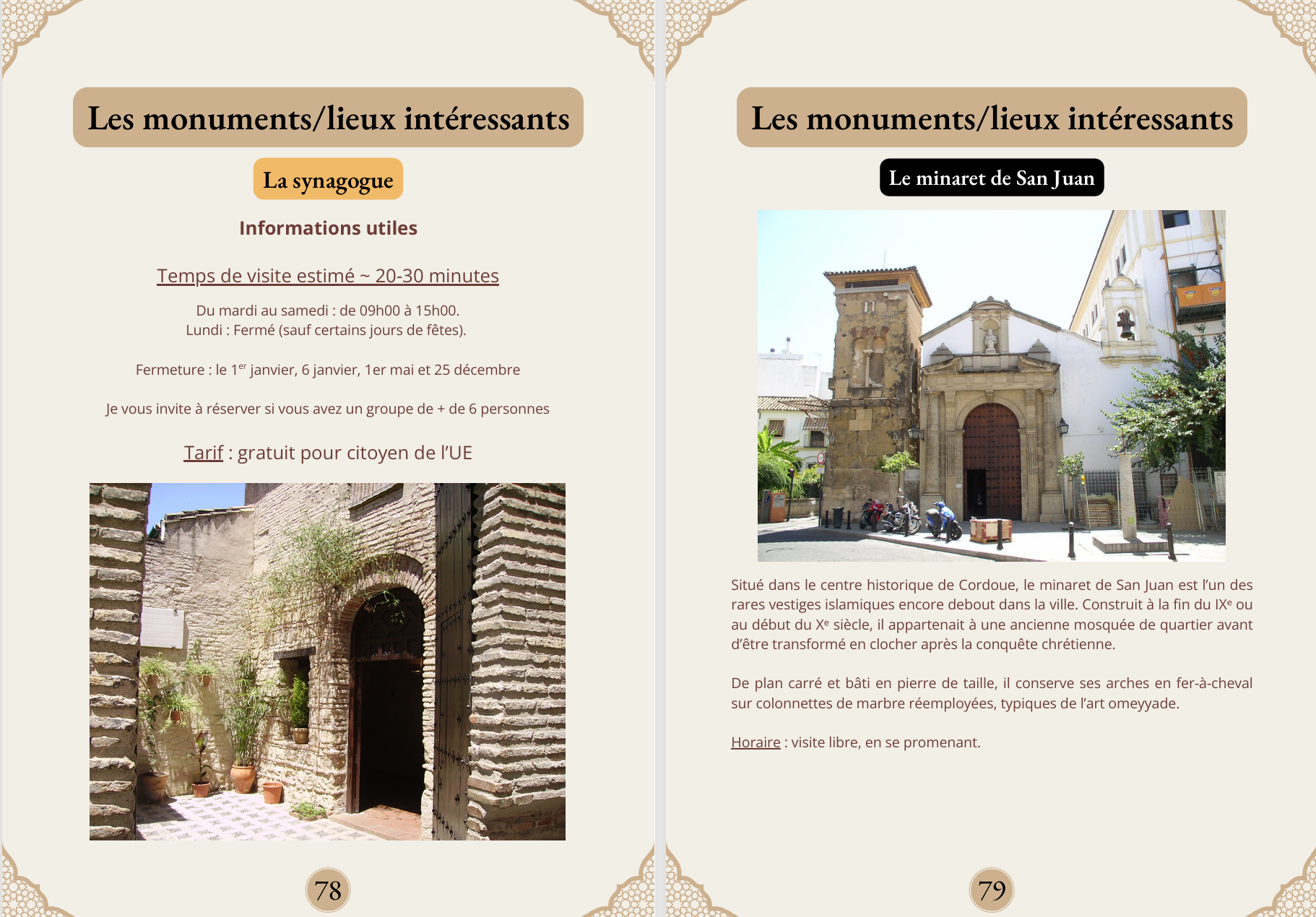 Un livret détaillé vous présentant tous les sites à visiter, des plus connus comme la mosquée‑cathédrale, jusqu’aux trésors cachés, comme les minarets encore visibles au sein d’églises.